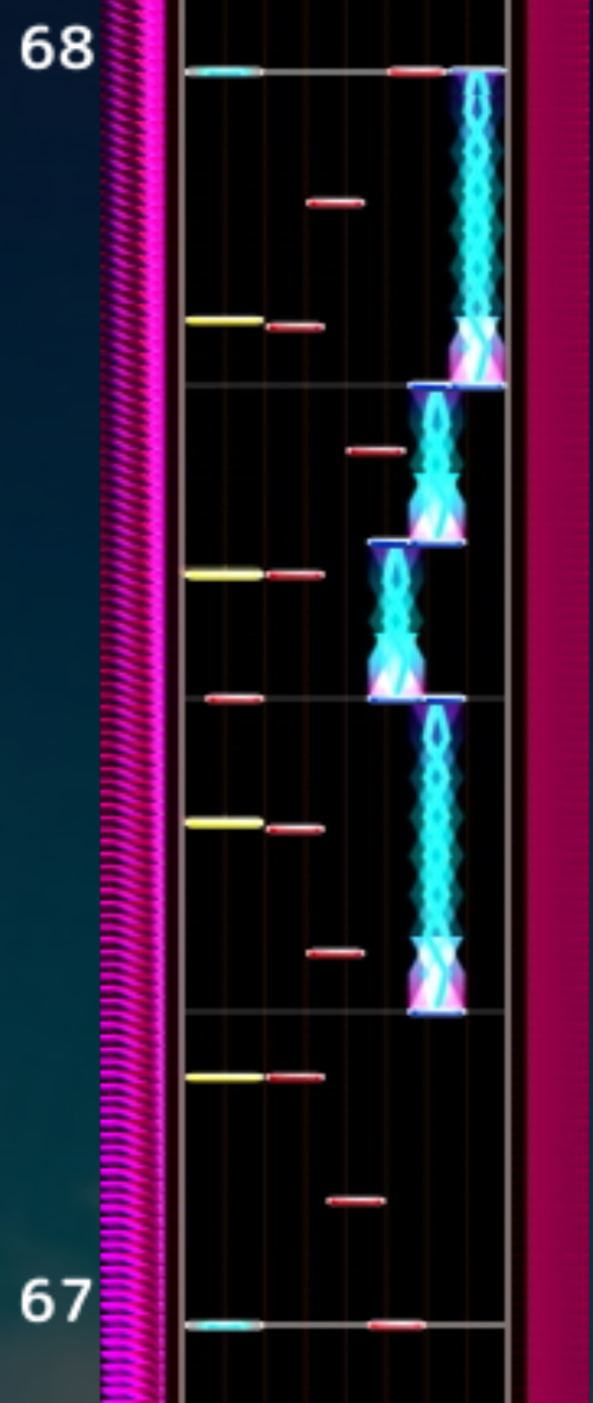 - 軸とはいわゆる一定のリズムで降ってくるレーンのことです。軸を意識しすぎてしまうことで頭の中で2つのリズムを同時に認識する必要が出てきてしまい、頭がバグりやすいです。